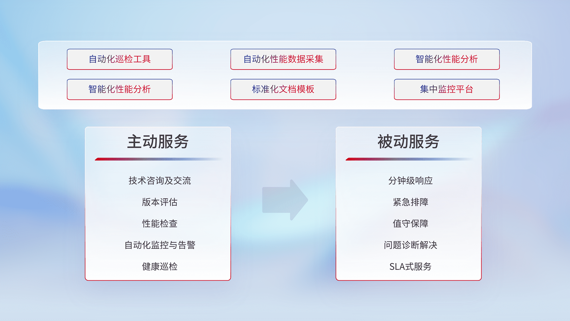 智能化工具和标准化文档,,,,保障服务质量,,,,提供主动服务(包含技术咨询、、版本评估、、、性能检查、、自动化监控与告警、、、健康巡检)和被动服务包含(分钟级响应、、、紧急排障、、、、值守保障、、、、问题诊断解决、、、、SLA服务)。。